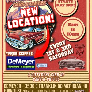Treasure Valley Cars and Coffee The Treasure Valley Cars and Coffee is the first and ... 03 Jan 8:00 am - 10:00 am DeMeyer Furniture - Meridian3530 East Franklin Road, Meridian, ID