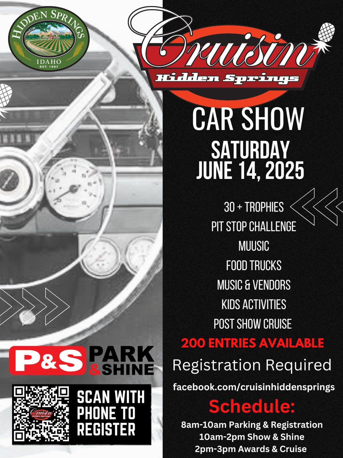 The Cruisin Hidden Springs Car Show is Saturday from 10am to 2pm at Hidden Springs Park, 5876 Hidden Springs Drive.